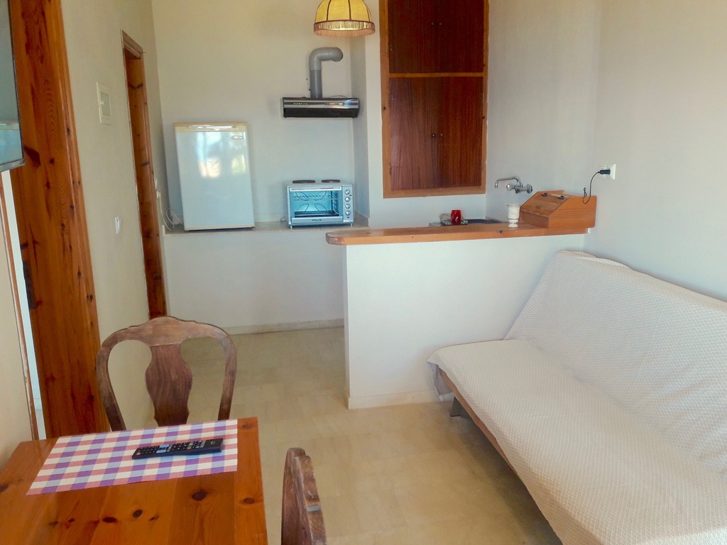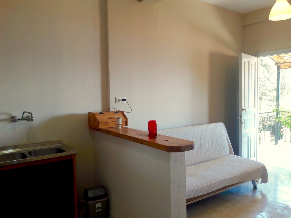 Nissaki Suite Artemis is located on the ground floor of a 2 storey building surrounded by peace and greenery. Independent access with a private staircase leads to the large balcony, beautifully furnished and perfect for enjoying the sea-views, enjoying a drink or having a delicious al-fresco dinner. Inside the apartment is modernly furnished and welcoming. Enjoying long night sleeps with the sound of the waves just below will be a truly memorable experience! There is a spacious, open plan lounge with kitchen and dining area as well as a sofa bed (double) leading directly to the terrace. The spacious bedroom, has a double bed and is provided with satellite TV (free channels only). The large bathroom has a walk-in shower. Linen and towels are provided. The bedroom is air-conditioned/heated (individually controlled by the guests 24/7) and this service is included in the price.