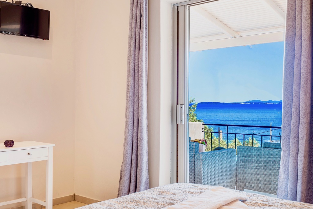 Despite being located just 2 steps away from the sea, the property is surrounded by greenery, flowers and Mediterranean shrubs. From the balconies and bedrooms guests can hear the gentle sound of the waves and enjoy the views to the Mediterranean Sea up to Corfu Town in the distance. There is even a small vegetable plot run by the owners where guests are welcome to pick up fresh products for cooking delicious organic meals. A shared barbecue and a common laundry room are available for the guests. A parking area is also available on the premises (availabile on a first-come first-served basis).