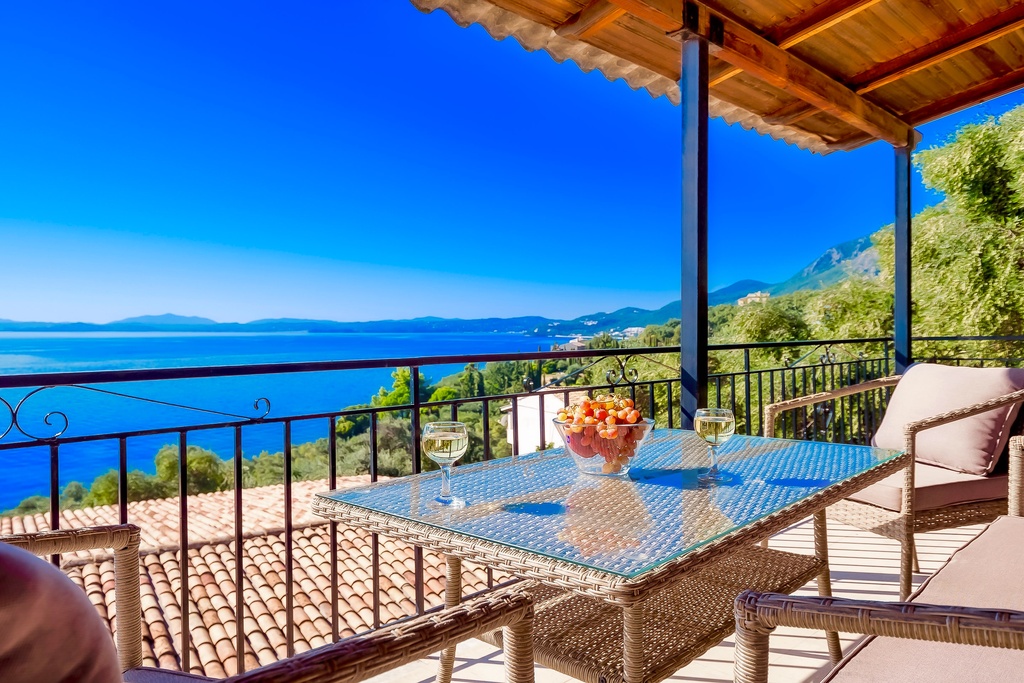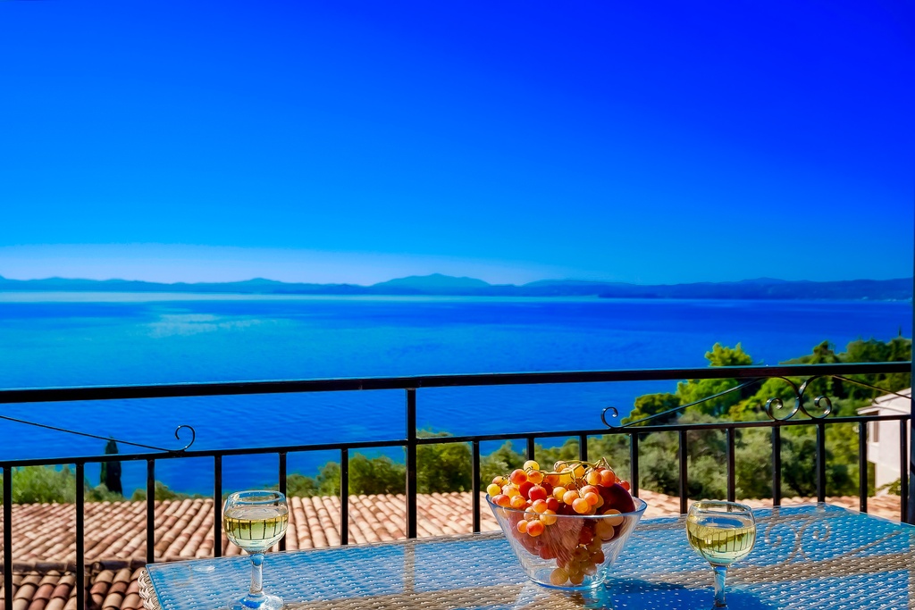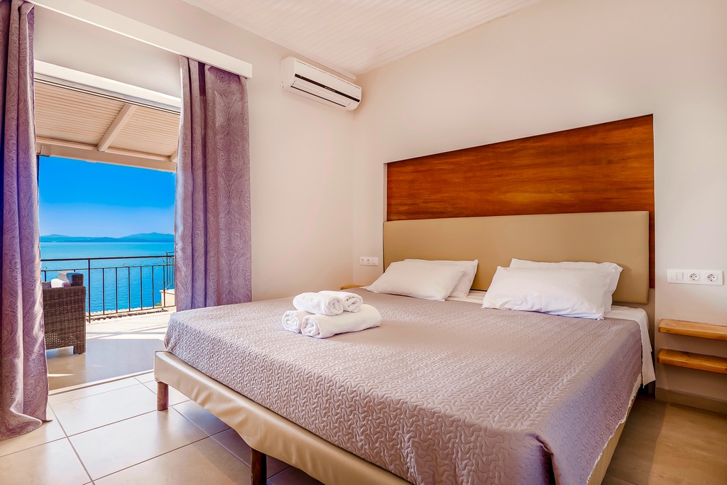 Nissaki Suite Poseidon is located on the first (and upper) floor of a 2 storey building surrounded by peace and greenery. Independent access with a private staircase leads to the large and breathtaking balcony, beautifully furnished and perfect for enjoying the panoramic views, enjoying a drink or having a delicious al-fresco dinner. Inside the apartment has been totally renovated with classy details, modern colour scheme and high quality furniture and bedding. Enjoying long night sleeps with the sound of the waves just below will be a truly memorable experience! There is a spacious, open plan lounge with kitchenette and dining area, leading directly to the terrace. The bedrooms, welcoming and airy, are respectively a double and a twin. Both are fully air-conditioned and provided with spacious fitted wardrobes and high quality mattresses, sheets, satellite TV, etc. The master bedroom, with double bed, has big patio doors leading to the sea-facing terrace. Particular attention has been given to the lighting of the indoor and outdoor areas, to provide a further ambiance and atmosphere. The family bathroom has a large walk-in shower. The apartment is air-conditioned/heated (individually controlled by the guests 24/7) and this service is included in the price.