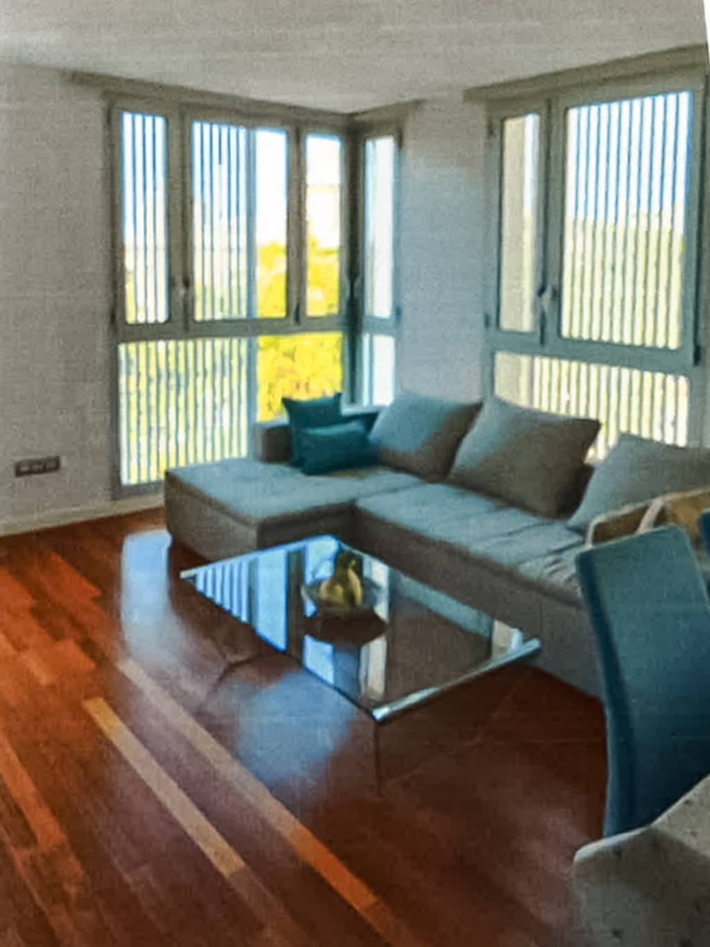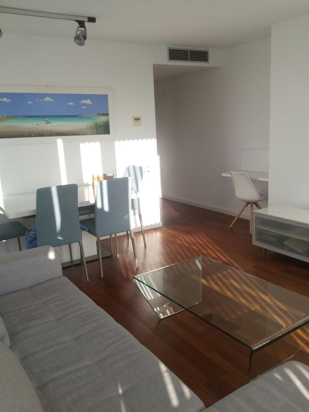 Living room, very luminous, with marvellous direct views to the Port Vell. Fully equipped kitchen with ceramic hob, fridge, oven, microwave and dishwasher.