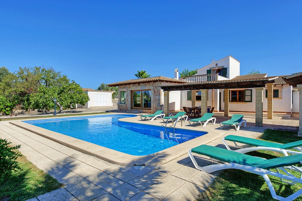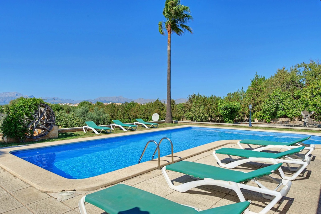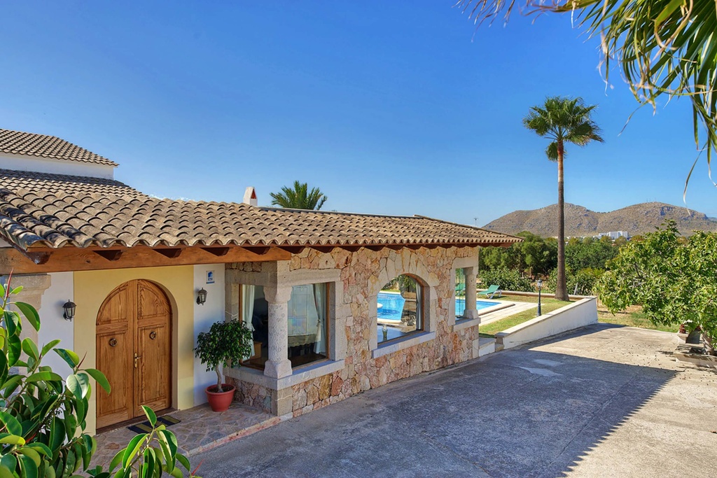 This spacious detached country house is conveniently located mid-way between Alcudia old town and of Port Alcudia with its sandy beach, marina, shops and restaurants. The tranquil country setting is ideal for a peaceful relaxing holiday with good privacy. On the ground floor there is a spacious lounge, dining room, separate kitchen, two double beds, one with en-suite shower room, a twin bedroom, a separate shower room and a shower room. On the first floor there are two twin bedrooms, one with a private ensuite shower room. The exterior offers spacious poolside terraces and next to the dining area there is a built in BBQ. Lawns and mature gardens surround the pool area with sun beds and a parasol provided to soak up the sun. The villa has an orchard with Oranges and Lemons so help yourself to fresh fruit! There is an outside shower, toilet and off road parking available.