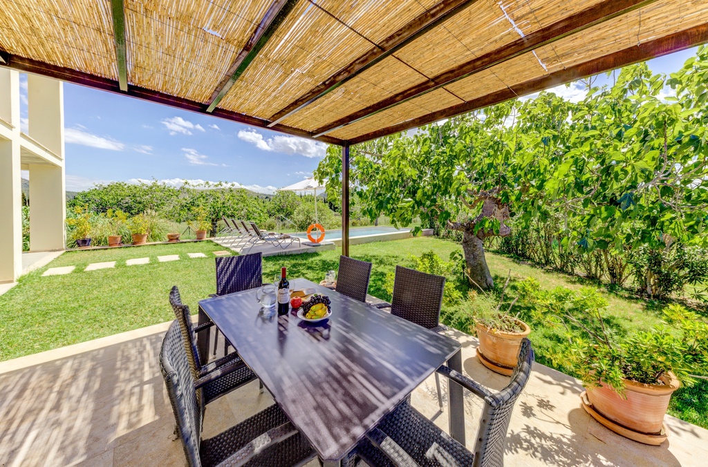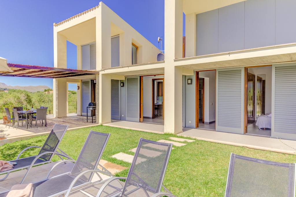 Villa Vertent is the perfect example of how modern architecture merges harmoniously with the pristine Mallorcan landscape. Completely private and with an elegant finish, this villa offers impressive views over the surrounding fields and majestic mountains. With the white sandy beaches of Puerto de Pollensa just a short drive away, this first-class property is the ideal destination for a luxury holiday. Villa Vertent can accommodate 4 people in 2 bedrooms, both equipped with air conditioning, ensuring maximum comfort throughout the stay. The interior of the villa stands out for its elegance and brightness. With marble floors and brilliant white lighting, the spaces feel spacious and cosy. Monochromatic furniture adds a contemporary touch, while large windows allow natural light to flood every corner of the house. All rooms are at ground level, providing easy and comfortable access. The living room is stylishly decorated and includes a wood-burning stove that adds warmth on cooler days. From the living room, you can access a dining terrace that connects directly to the garden, creating an ideal space to enjoy the views. The fully equipped kitchen has French doors leading to a charming breakfast terrace at the front of the house, perfect for starting the day outdoors. The villa's bedrooms and bathrooms are simple but extremely sunny and bright. The master bedroom, with a double bed, has an en-suite bathroom that includes both a shower and a bathtub, providing maximum comfort. The second double bedroom is particularly spacious, with a desk and chair, and has doors that open directly onto the garden terrace. From this bedroom, you can enjoy a beautiful view of the cultivated fields and distant mountains. Additionally, there is an extra family bathroom with a shower for guests' convenience. The garden and pool are as special as the interior of the house, offering a relaxing and private atmosphere. Green lawn surrounds the pool, complemented by colourful flowers and shrubs that add a touch of freshness, alongside a beautiful old tree that provides natural shade. The pool is perfect for cooling off, swimming, or simply relaxing by the water. Villa Vertent is undoubtedly an incredibly elegant house, ideal for a luxury holiday with family or friends, where the beauty of the landscape combines with the comfort of modern design. Free air conditioning from 2:00 PM to 4:00 PM and from 8:00 PM to 8:00 AM, to ensure well-being during the hottest hours of the day. Important information to keep in mind: In the event of key loss or if keys are left inside the accommodation, a charge of 50 € will be applied during office hours and 75 € outside of office hours. New keys must be collected by the guest at our office. On the check-out day, no rubbish should be left on the property. Guests must remove it; otherwise, a charge of 150 € will be applied for waste management. The guest registration is required by law in Spain (Royal Decree 933/2021, of 26 October) and Greece (Law 4446/2016), therefore close to your arrival date, we will send an online check-in link for the registration of all guests.
