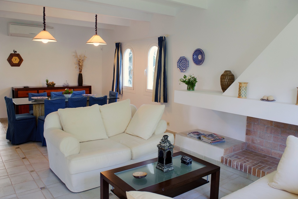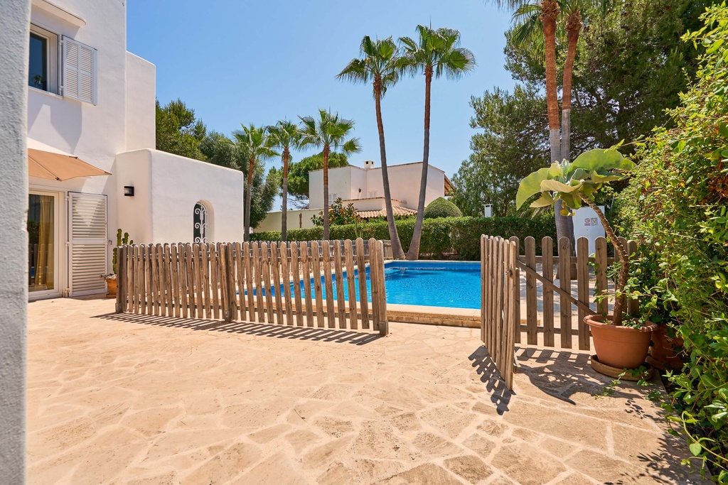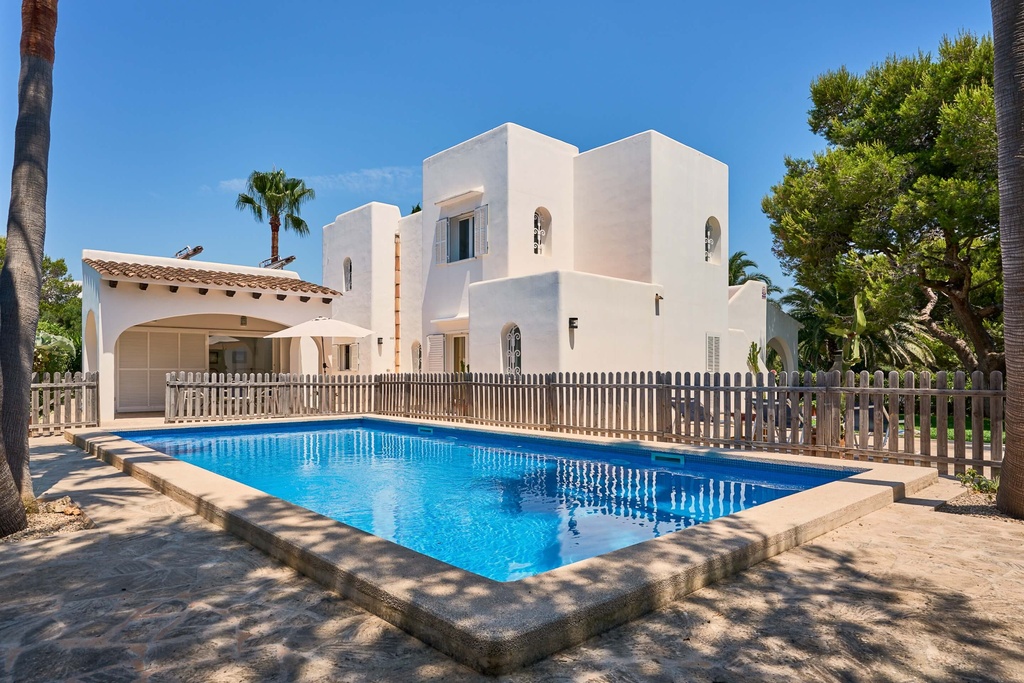 Beautiful typical Ibiza style villa, airy and full of natural light with covered terraces and a large lawned garden. The villa has two floors. The ground floor offers an open living/dining area with comfortable sofas and a dining table. From the living area there is access to a large covered terrace and to the lawn garden. The kitchen is well equipped and has access to the exterior. This floor also has two twin bedrooms with access to the covered terrace. Both share a separate bathroom and a shower room with two single showers. There is also a double bedroom with access to the pool terrace and an en-suite bathroom. The first floor boasts a spacious double bedroom with en-suite bathroom with a dressing area. From this bedroom there is access to a terrace roof. This bedroom can also be reached by exterior stairs from the garden to the terrace roof. Outside by the pool we find a separate small twin bedroom with an en-suite shower room and a small coverd terrace.