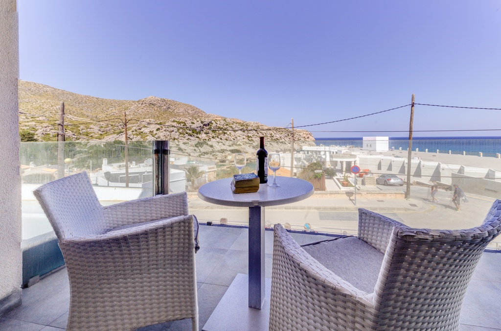 The apartment is located on the first floor and offers a stunning, sea-facing balcony to enjoy the views and a pleasant outdoor drink. The lounge and the kitchen, well furnished and spacious, have big patio doors (full size) providing breathtaking views and access to the balcony. There are 2 bedrooms in total, 1 double bedroom with ensuite shower and 1 twins bedrooms, as well as 1 modern bathroom with shower. Air-conditioning is available and included in the rental price at set times (2pm-4pm, 8pm-8am). Due to its unique location, modern decor and stylish details, this property is a true gem not to be missed!