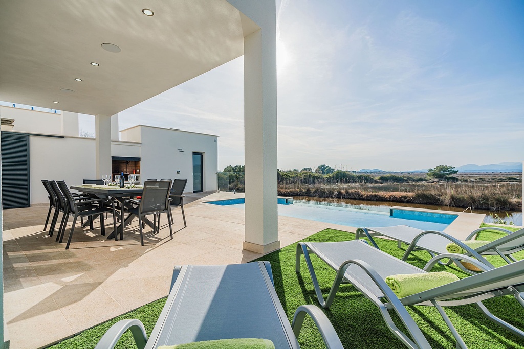 The villa is distributed across two floors. A ramp leads you through the main door, which opens to an open living room. Take your time in our fully equipped kitchen while conversing with your family in the elegant living room, where you can enjoy satellite TV and wifi. Two sliding glass doors illuminate the entire space, from which you can access a double room with a queen-size bed and a family bathroom with an accessible shower. The first floor has three more bedrooms, the master bedroom has a double bed with a window and an en-suite bathroom. An additional family bathroom is shared by two twin rooms, both with their sliding glass doors leading to a balcony overlooking the impressive Albufera.