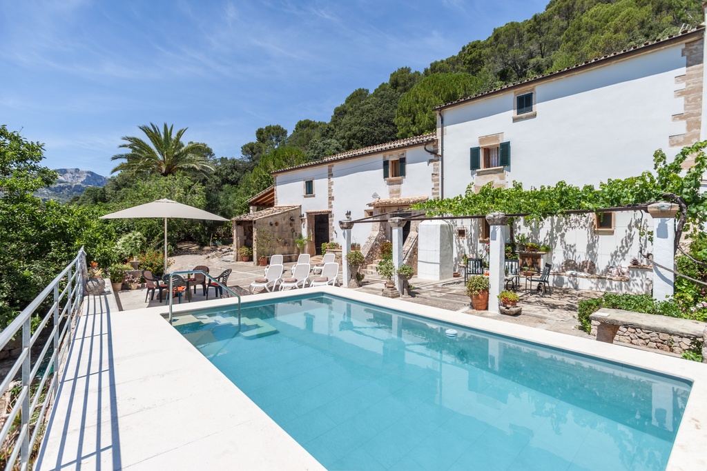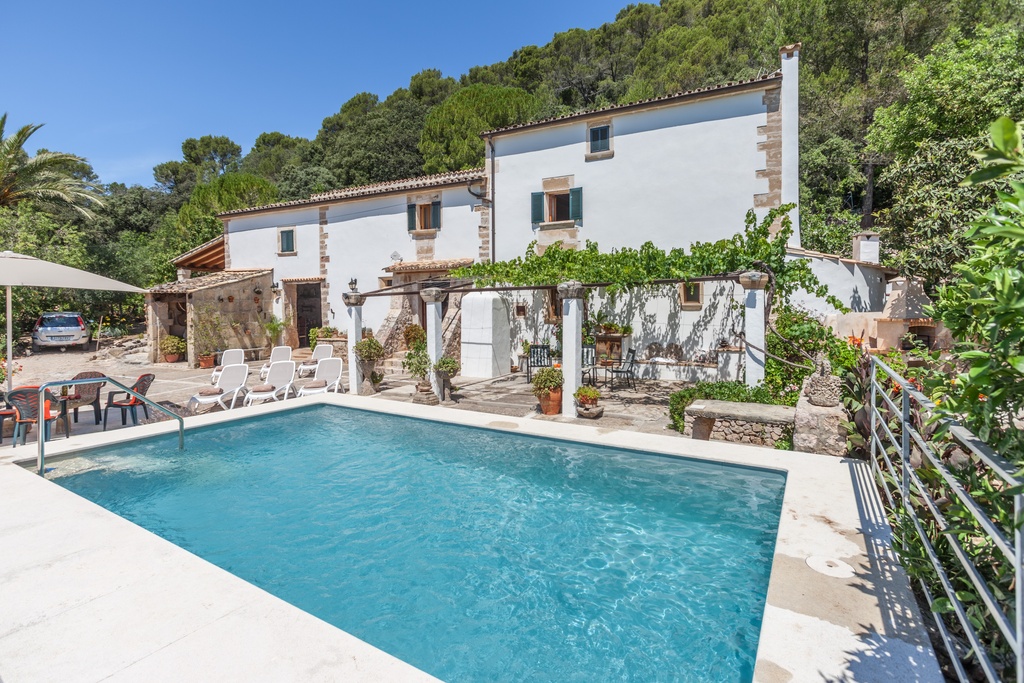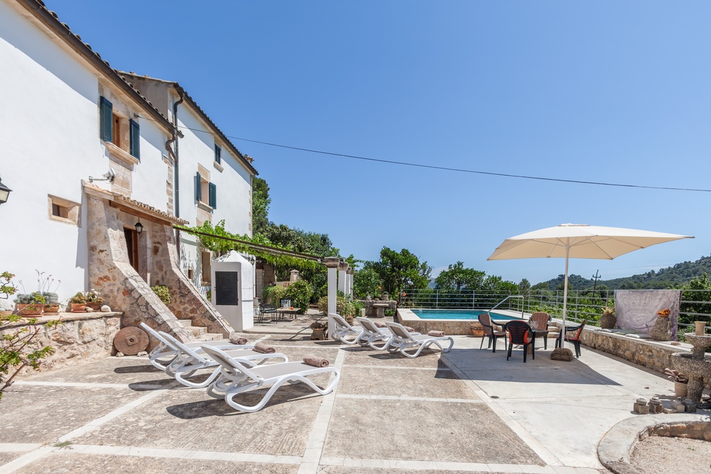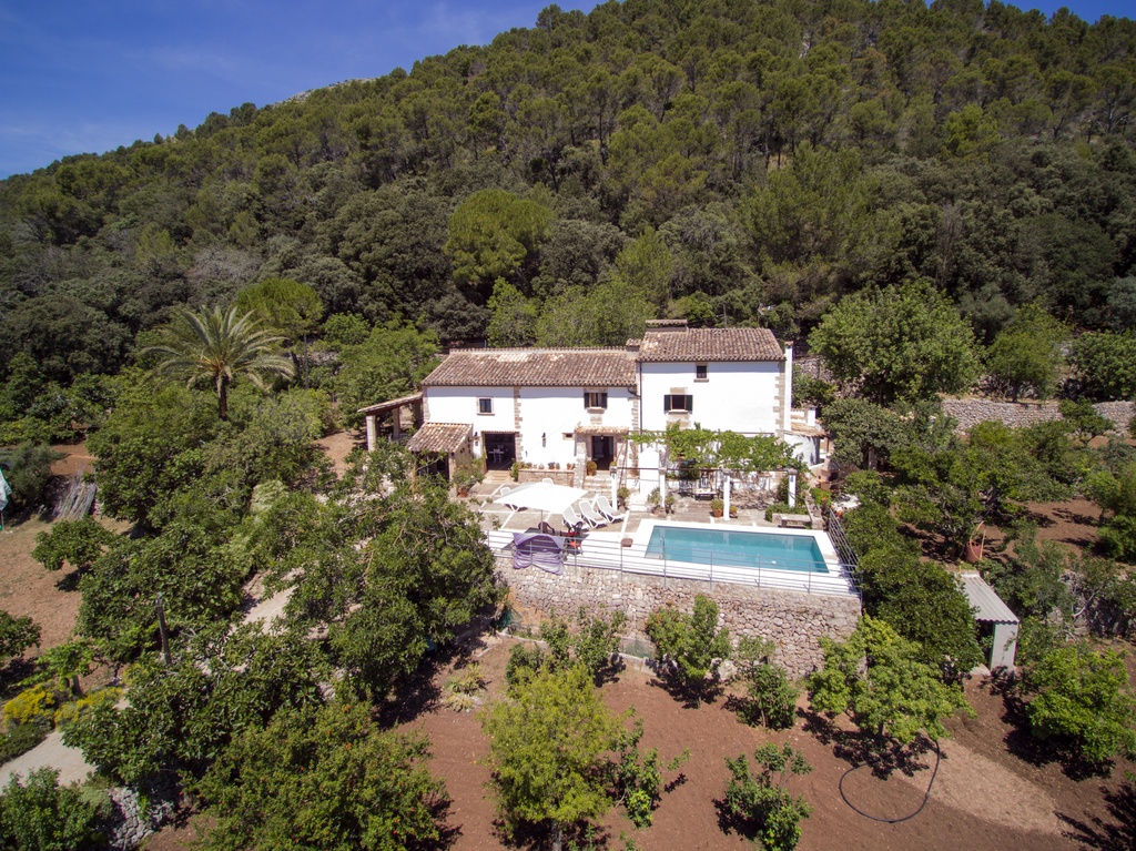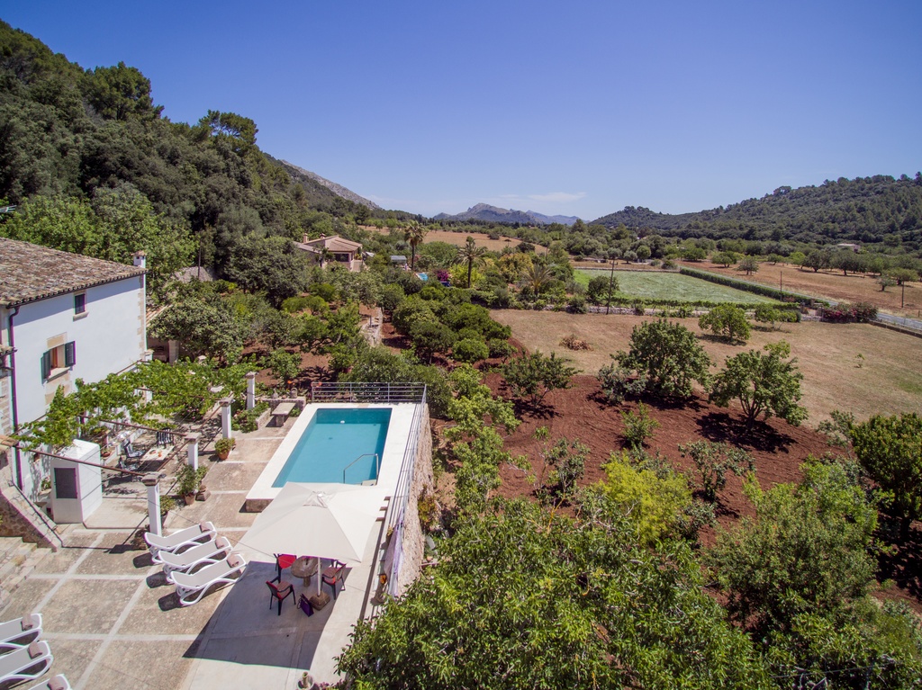 The road leading to the village of Lluc is a heaven of peace and tranquillity in one of the most unspoilt areas of the island. And it is in this area, just 2.5km away from the old town of Pollensa, that Villa Cals Frares stands proudly above the valley below. Villa Cals Frares has its own soul, its own history, that is now shining again in all its glory after a careful refurbisment. Built in 1925 and belonging to the same family by then, this huge “finca” (traditional Mallorcan farmhouse) is now a comfortable independent holiday home with 3 bedrooms, 2 bathrooms, private pool and extensive outdoor areas providing privacy and seclusion in a truly authentic atmosphere. The history that made great this property can still be visible everywhere on the premises: precious handmade tissues of Pollensa decorate the internal walls, while old agricultural tools are still visible all around the surrounding gardens and fields (measuring the impressive size of more than 220.000 sqm).