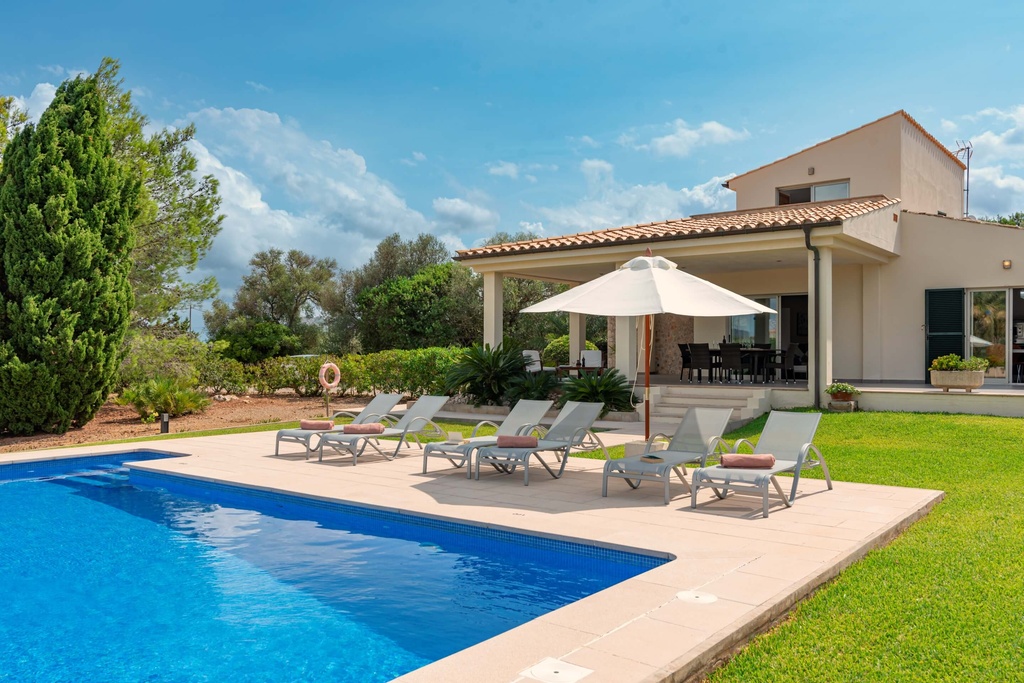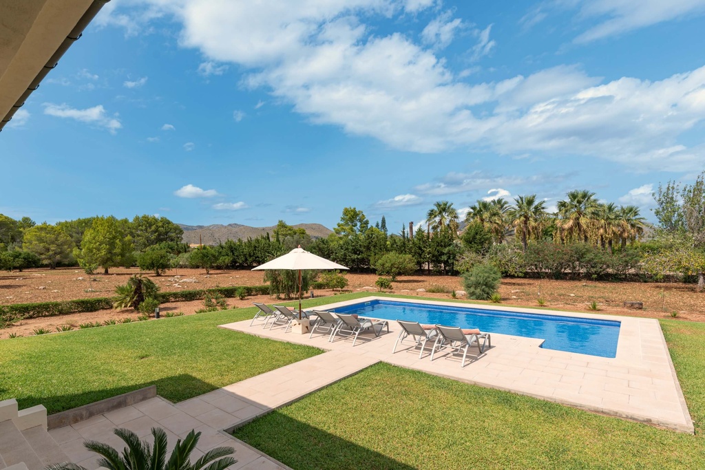 The inviting swimming pool is situated to the side of the house and is surrounded by lawns on all sides. It will be the perfect spot to enjoy long hours under the warm Mallorcan sun, take a refreshing dip or just read a book. The outdoor terraces overlooking the pool and the garden provide shade during the hottest hours of the day and are equipped with tables and chairs for al-fresco dining.