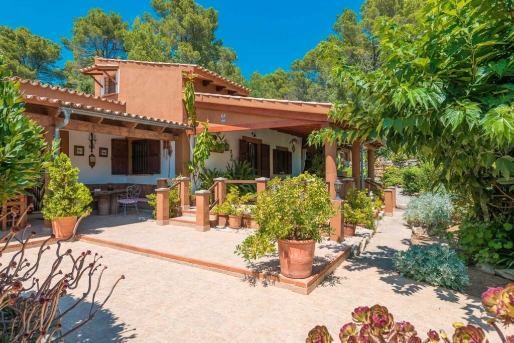 Villa Es Refugi is a small paradise of privacy surrounded by idyllic gardens that provide a serene and welcoming atmosphere. The exterior of the villa features an impressive swimming pool, surrounded by beautiful plants that create the perfect space to relax and enjoy the Mediterranean climate. Around it, a terrace equipped with chairs, loungers, and umbrellas invites you to spend long hours in the sun while enjoying the tranquility of the surroundings.