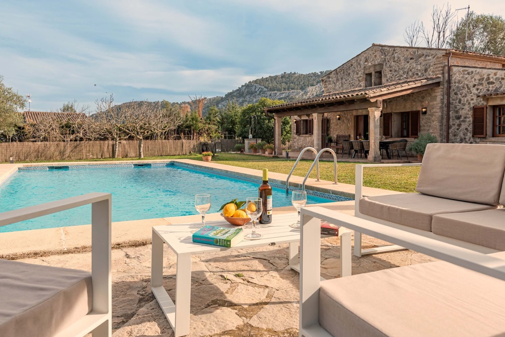 The beautiful Finca Gloria is a traditional villa built with Mallorcan stone, located in expansive gardens that offer a sense of tranquility and privacy. Outdoors, the villa features a well-equipped barbecue area and a dining table on a covered terrace, perfect for enjoying delicious meals al fresco. In addition, its spacious terraces provide charming views of the pool area, creating the ideal atmosphere to relax and enjoy the natural surroundings. Situated in a quiet area, the villa is perfect for couples or small groups seeking a peaceful and relaxing vacation.