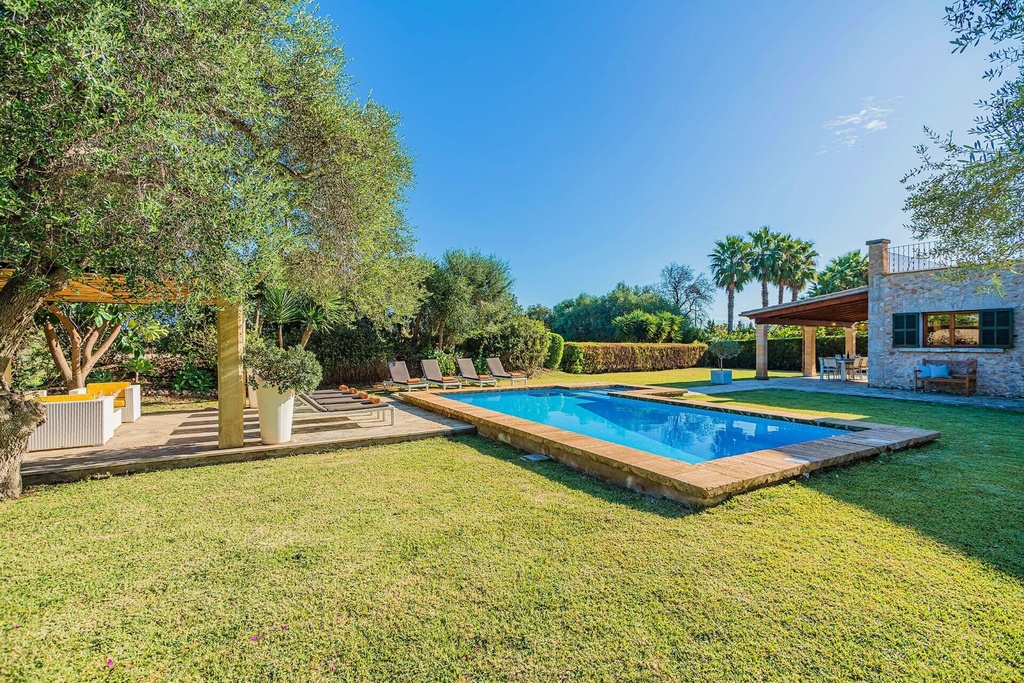 The exterior is carefully designed to ensure a complete relaxation experience, with a refreshing pool, sun loungers, and a large garden where you can enjoy the Mallorcan breeze. Next to the pool, you'll find a cozy shaded chill-out area, perfect for relaxing, reading a book, or simply enjoying the company. On the other side, also in the shade, there is an outdoor dining area with a table, ideal for enjoying al fresco meals in a peaceful environment. Also, the villa has table tennis table.