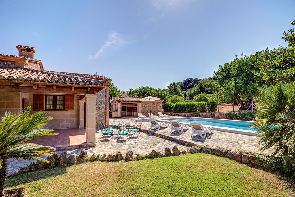 Charming holiday home located just below the majestic Serra de Tramuntana, in the municipality of Pollensa. This refuge is ideal for those seeking to disconnect and enjoy the peace and serenity offered by the island, as it is located in a very quiet area of the Son March valley, but only 5 km from the picturesque town of Pollensa and the stunning beaches of Puerto Pollensa. This privileged location allows you to be close to all services and the vibrant local life, while enjoying the calm and beauty of nature in its maximum expression. The villa is completely distributed on a single floor. The dwelling is furnished with great style and comfort, offering three bright and cosy bedrooms, all with adjustable air conditioning to ensure a pleasant temperature at all times. The two bathrooms in the house are equipped with all the necessary elements, guaranteeing comfort and functionality. The house has been decorated in a traditional Mallorcan style, creating a relaxing and homely atmosphere. The exterior of the villa is equally charming, perfectly integrated into the mountainous and rural environment. It has a spacious terrace with a swimming pool, surrounded by shaded areas provided by trees and pergolas, which offer the ideal place to relax or enjoy a refreshing drink while contemplating the landscape. The pool is the perfect place to cool off during the hot summer days, while the terrace invites you to spend long hours enjoying the tranquillity of the place. In addition, the villa has an outdoor barbecue area, equipped with a sink and sufficient space to prepare delicious outdoor meals, which makes the evenings a unique experience. It also has an additional outdoor shower bathroom, allowing you to enjoy the pool area without the need to enter the house. Without a doubt, this villa is the perfect refuge to enjoy a peaceful holiday, in full contact with nature and surrounded by a spectacular landscape. The combination of its environment, its amenities and its proximity to the attractions of the area make this place an ideal option for those seeking a retreat of peace and comfort. Important information to take into account: In the event of key loss or if keys are left inside the accommodation, a charge of €50 will be applied during office hours and €75 outside of office hours. New keys must be collected by the guest at our office. On the check-out day, no rubbish should be left on the property. Guests must remove it; otherwise, a charge of 150 € will be applied for waste management. The guest registration is required by law in Spain (Royal Decree 933/2021, of 26 October) and Greece (Law 4446/2016), therefore close to your arrival date, we will send an online check-in link for the registration of all guests.
