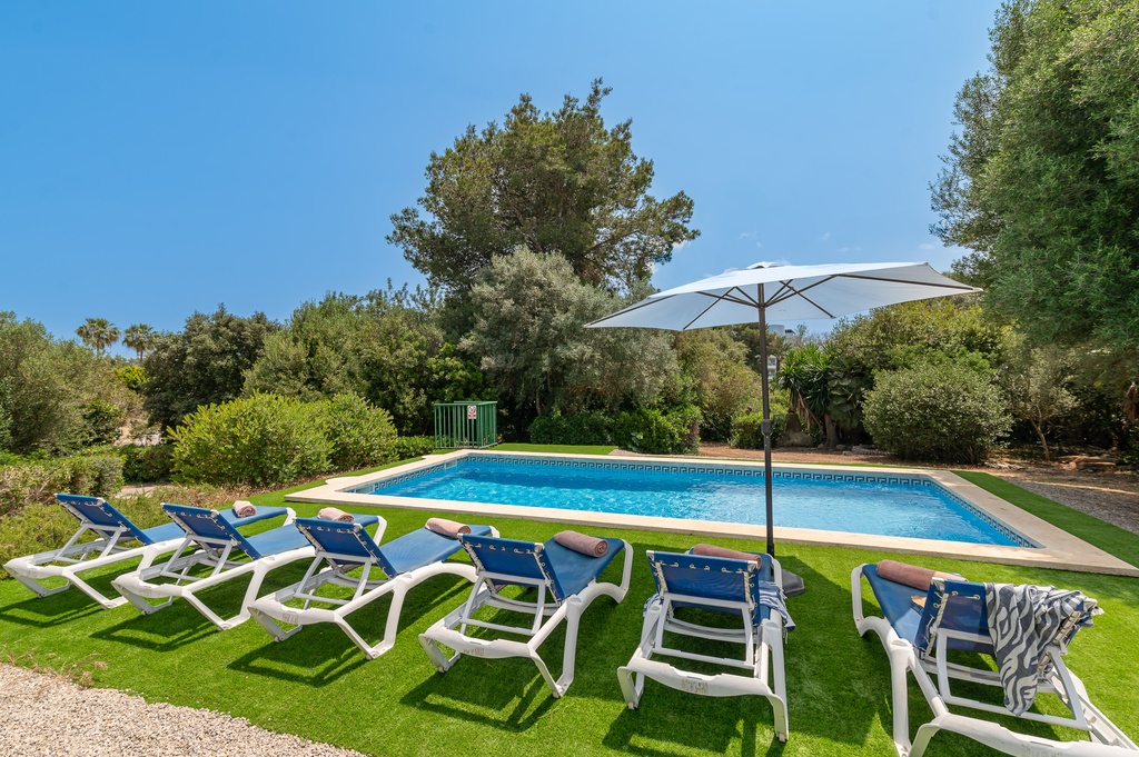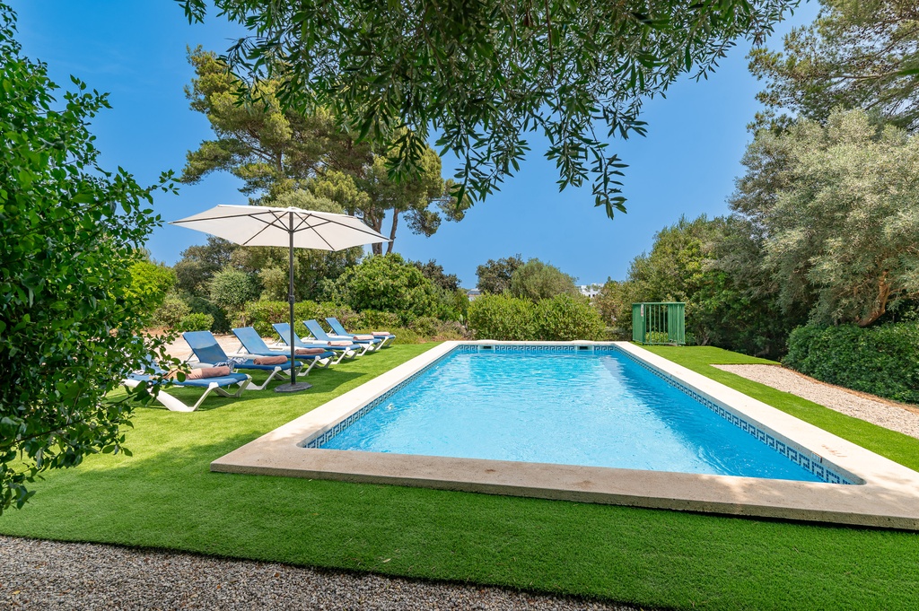 Villa Ca na Lloreta is in a great location, a short walk from the beach and amenities of Playa de Muro. The house has a private swimming pool and a large, sunny, south-facing garden. Plus, from the seating area at the top of the unique tower, you'll have marvellous panoramic views over the local area to the countryside and hills. This 3 bedroom villa has several authentic features, and includes WiFi and air conditioning/heating in all of the bedrooms. A short private lane leads to Villa Ca na Lloreta own parking area, with a pathway to the entrance. The combined lounge and dining area has plenty of seating by the TV, including a pleasant built-in bench by the window, as well as an ornamental fireplace and a table and chairs. The living space is traditionally furnished, with a typical tiled floor and beamed ceiling, and has patio doors onto the pool terrace. The neighbouring kitchen is fully equipped, and has a small breakfast table, with access to the rear of the property via the adjacent utility room. Kitchen has full oven, cooking hob, fridge/freezer, microwave, dishwasher, washing machine, toaster and kettle. Villa Ca na Lloreta has a double bedroom with an en suite shower room and 2 twin bedrooms which share a separate shower room. All 3 bedrooms are comfortable and well-furnished, with ample storage space. From the twin bedroom at the front of the villa, stairs lead up to a tower with a 360° view of the resort. All bedrooms have the benefit of air conditioning/heating Outside, Villa Ca na Lloreta has a private swimming pool, with a spacious sunbathing terrace on one side, and a large lawned garden to the other. The grounds face south ensuring a good amount of sunshine during the day, but the trees provide ample shade if you need a break from the heat. The patio outside the living area is also covered, creating a comfortable dining space, complemented by the brick BBQ to the far side of the garden. Villa Ca na Lloreta can sleep up to 6 people. (FREE Travel Cot and Highchair available on request.) Free air conditioning from 14:00pm to 16:00pm and from 20:00pm to 08:00am.