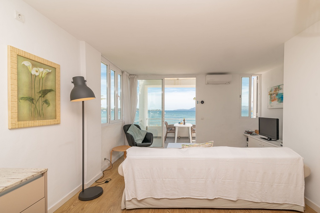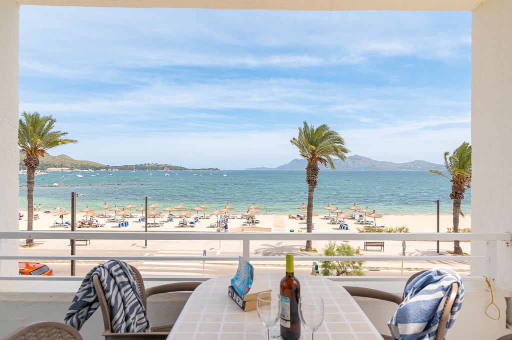 Big patio doors lead out to the front terrace, providing breathtaking views over the sandy beach, the promenade and the bay of Pollensa. A flight of steps lead up also to the rooftop terrace, a private area enjoying the most sensational views and a lot of additional space. For the comfort of our guests, even if a car is not necessary at this property, private parking (gated) is available on the premises free of charge.