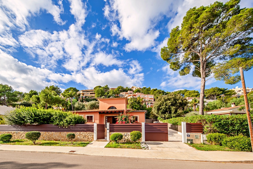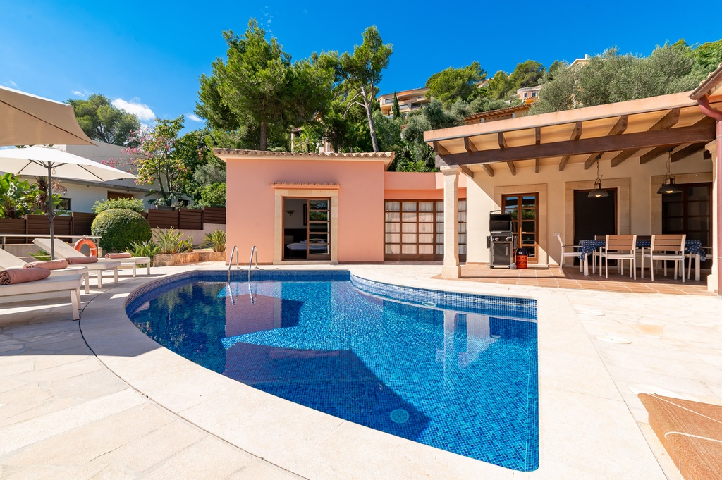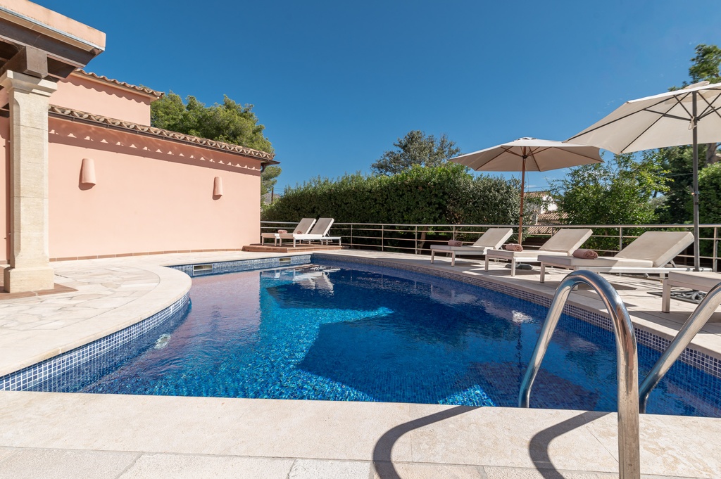 Outside, the villa is located within 1200 square meters of private land with pine trees, flowers, shrubs, and a cozy private pool. The private pool measures 6 m x 4.8 m (depth between 1.2 m and 2 m). Sunbeds are provided to enjoy pleasant relaxation hours under the warm Mallorcan sun. There is also private parking on the premises.